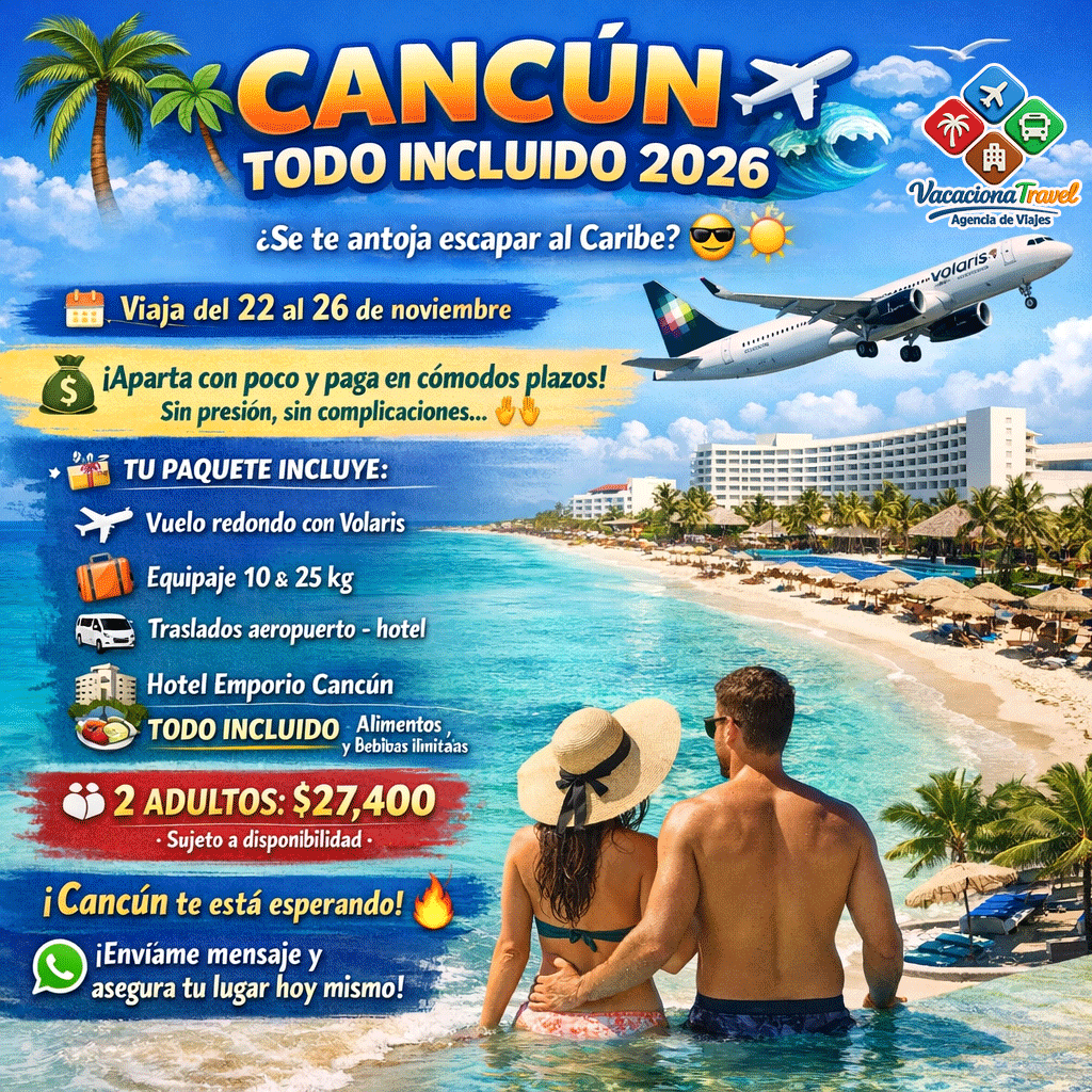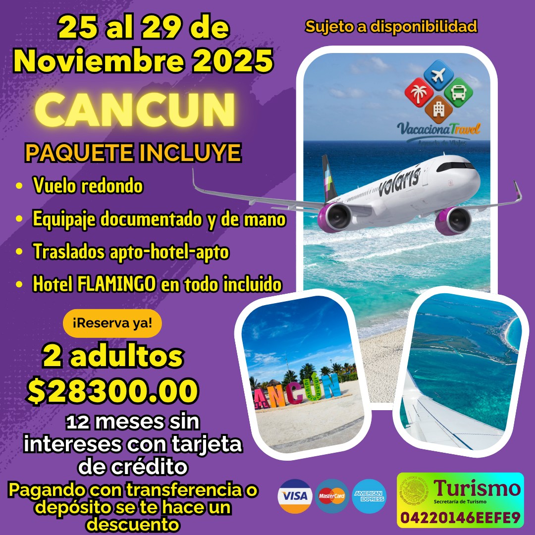¡𝗖𝗔𝗡𝗖𝗨́𝗡 𝗧𝗘 𝗘𝗦𝗣𝗘𝗥𝗔 𝗘𝗦𝗧𝗘 𝗡𝗢𝗩𝗜𝗘𝗠𝗕𝗥𝗘! Del 25 al 29 de noviembre 2025 vive unas vacaciones espectaculares con Vacaciona Travel 𝗣𝗔𝗤𝗨𝗘𝗧𝗘 𝗜𝗡𝗖𝗟𝗨𝗬𝗘: Vuelo redondo con Volaris Equipaje documentado y de mano Traslados aeropuerto–hotel–aeropuerto Hotel Flamingo Cancún en todo incluido 2 adultos Seguir leyendo Paquete a Cancun del 25 al 29 de noviembre 2025
