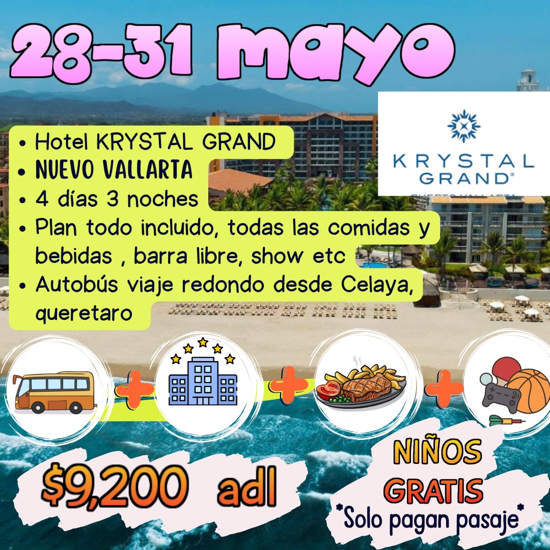 ¿A que hotel vamos? Hotel Krystal Grand Nuevo Vallarta. Se encuentra en Nuevo Nayarit (anteriormente conocido como Nuevo Vallarta), frente a la playa, con vistas a la Bahía de Banderas. Es un resort todo incluido (“all-inclusive”), lo que significa que Seguir leyendo Nuevo Vallarta del 28 al 31 de mayo viaje grupal desde Querétaro y Celaya