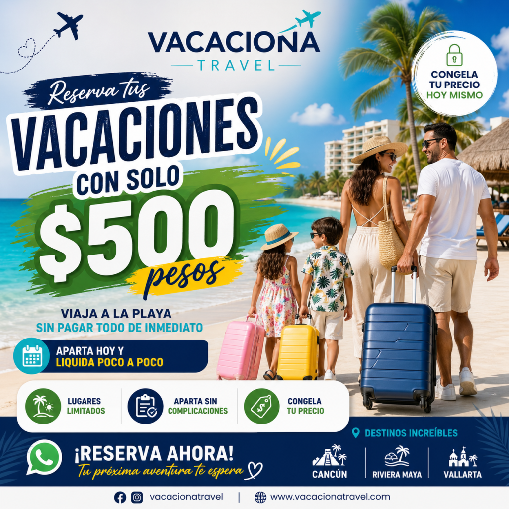 Del 31 de enero al 03 de febrero 2025, 14 al 17 de marzo 2025, 12 al 27 de abril 2025, 01 al 05 de mayo 2025, 01 de julio 2025 al 31 de agosto 2025, 12 al 16 de septiembre 2025, 01 al 03 de noviembre 2025, 14 al 17 de noviembre 2025, 27 al 30 de noviembre 2025, 12 al 31 de diciembre 2025. Toda reservación requiere de un depósito inicial de $700.00 (QUINIENTOS PESOS 00/100 M.N.) de anticipo por persona por persona para garantizar y/o confirmar los servicios. Se requiere un segundo depósito de $4,000.00 (CUATRO MIL PESOS
